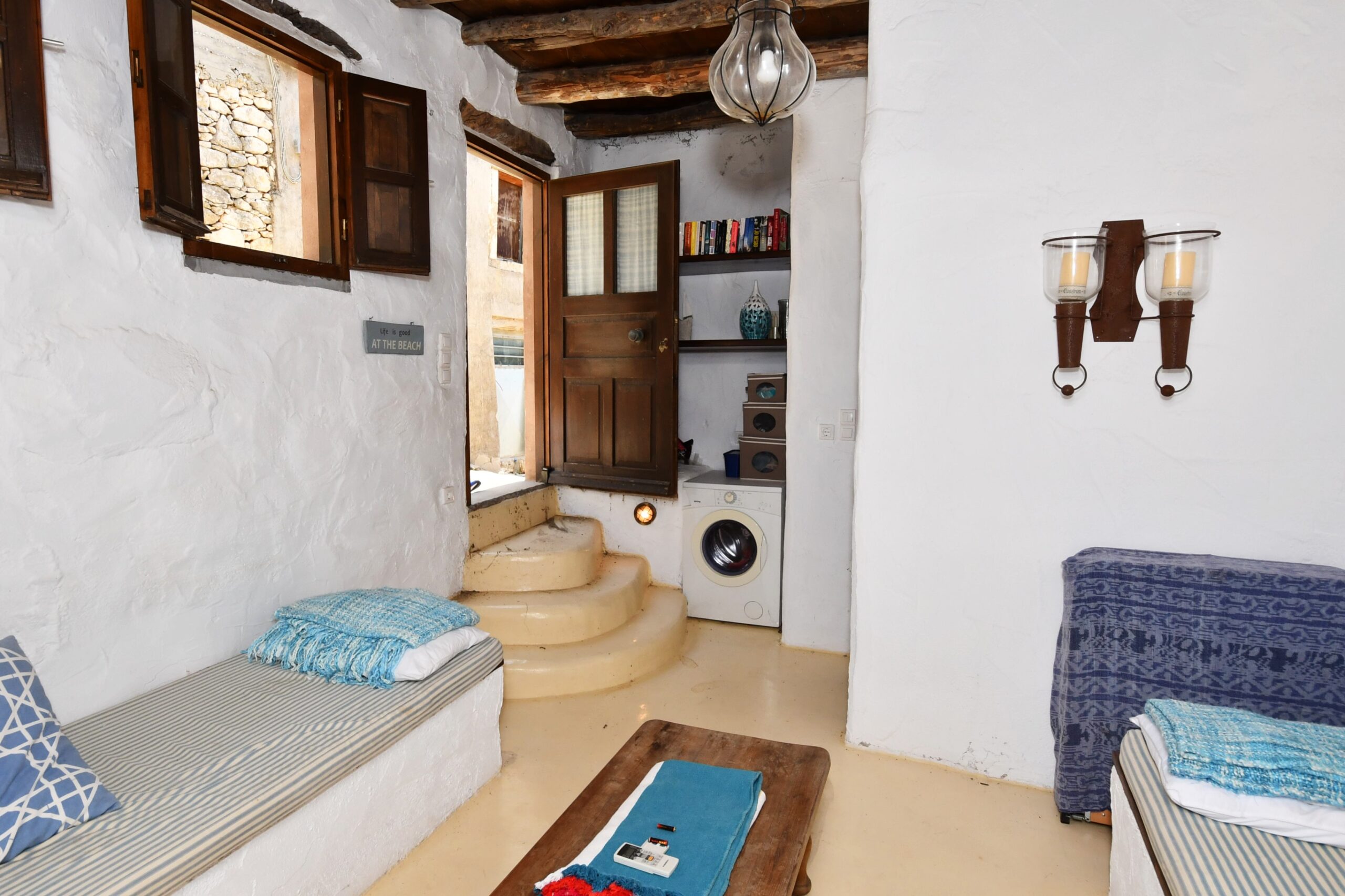 Living room with built in sofas/beds. Space and plumbing for washing machine.