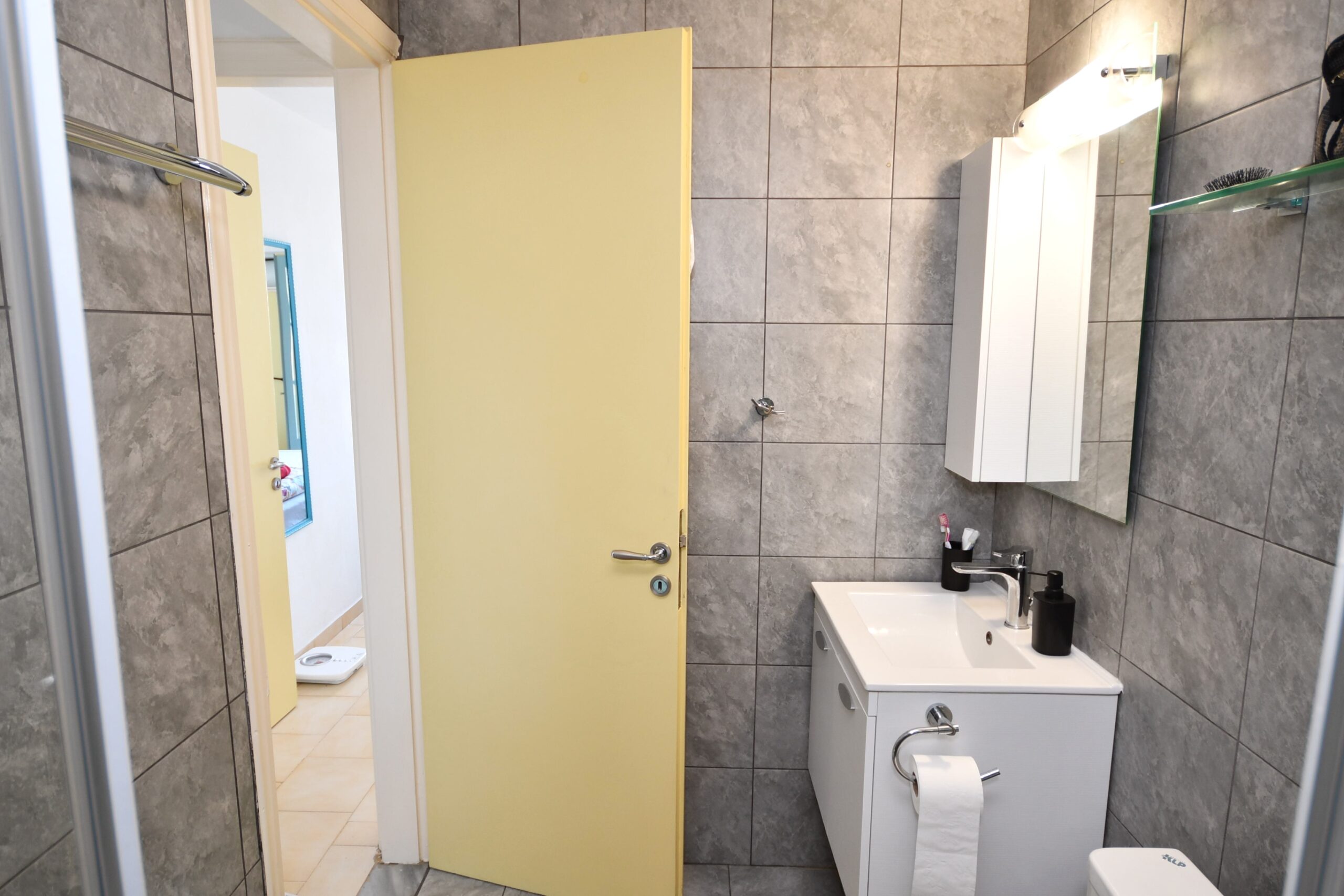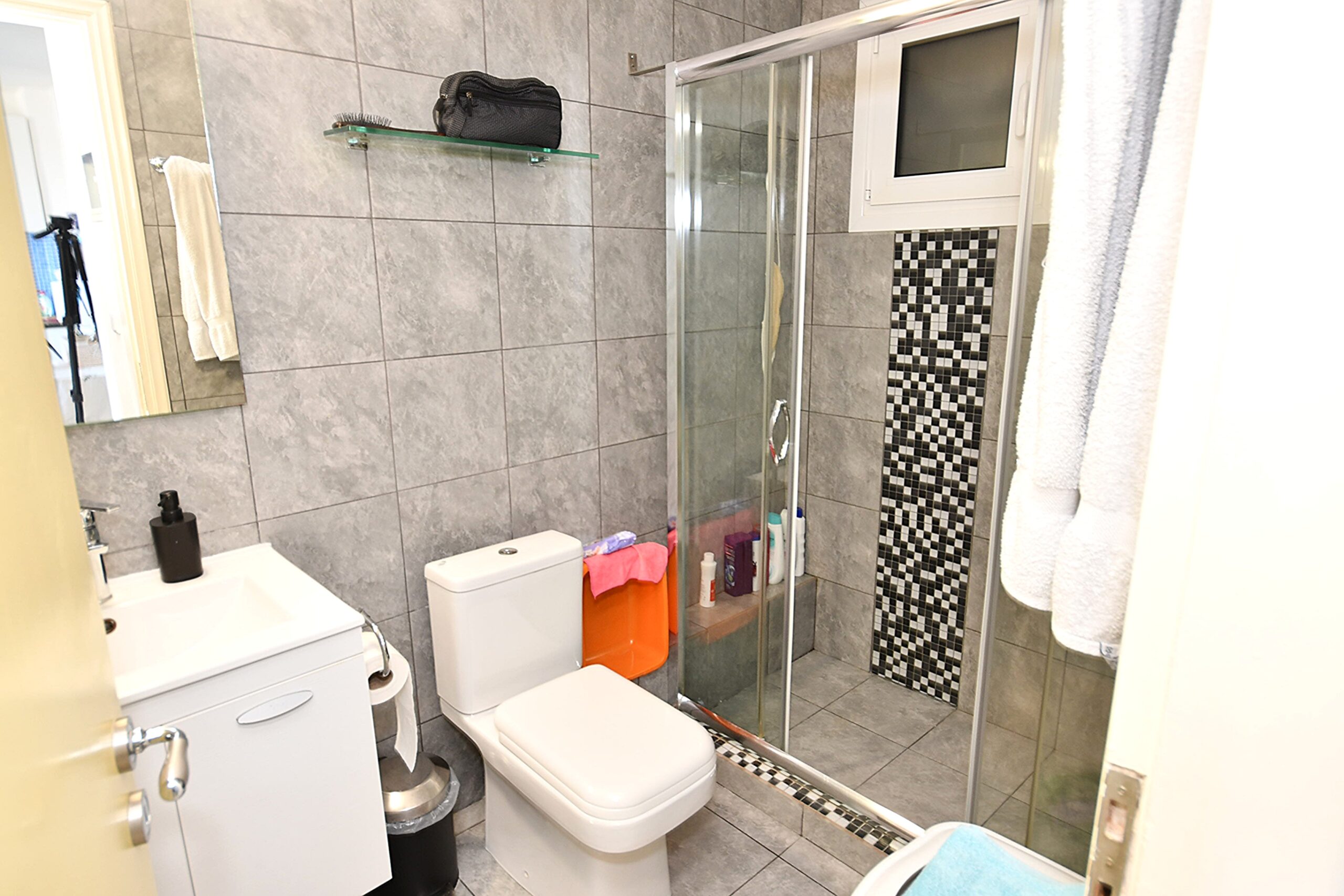 Shower room with walk in shower cubicle, wash basin and WC.
